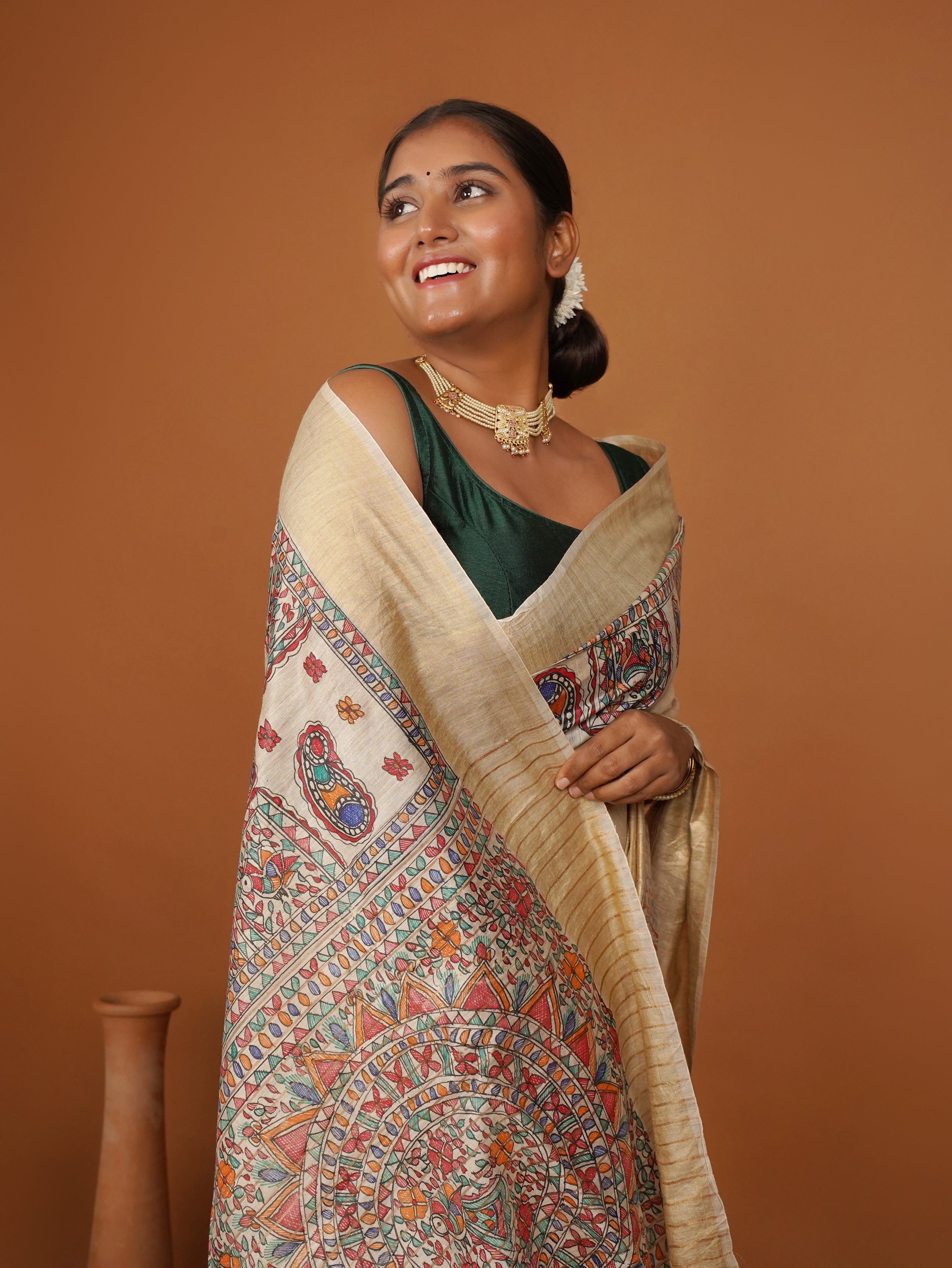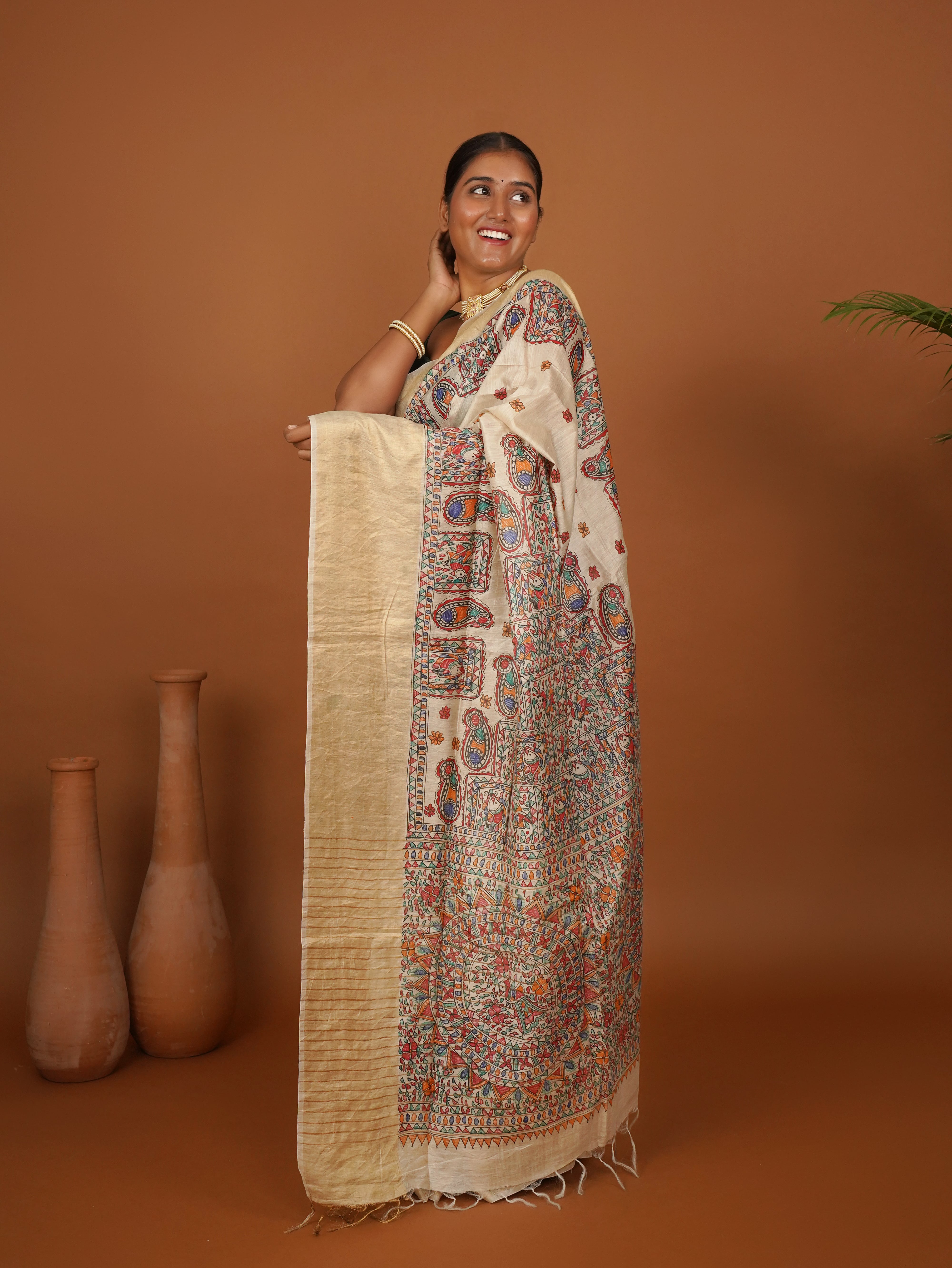 "Step into a tapestry of tradition with βKatha Kanch,β a luxurious beige Tussar silk saree adorned with a grid of handpainted Madhubani art panels β each square telling a unique folklore through vibra......