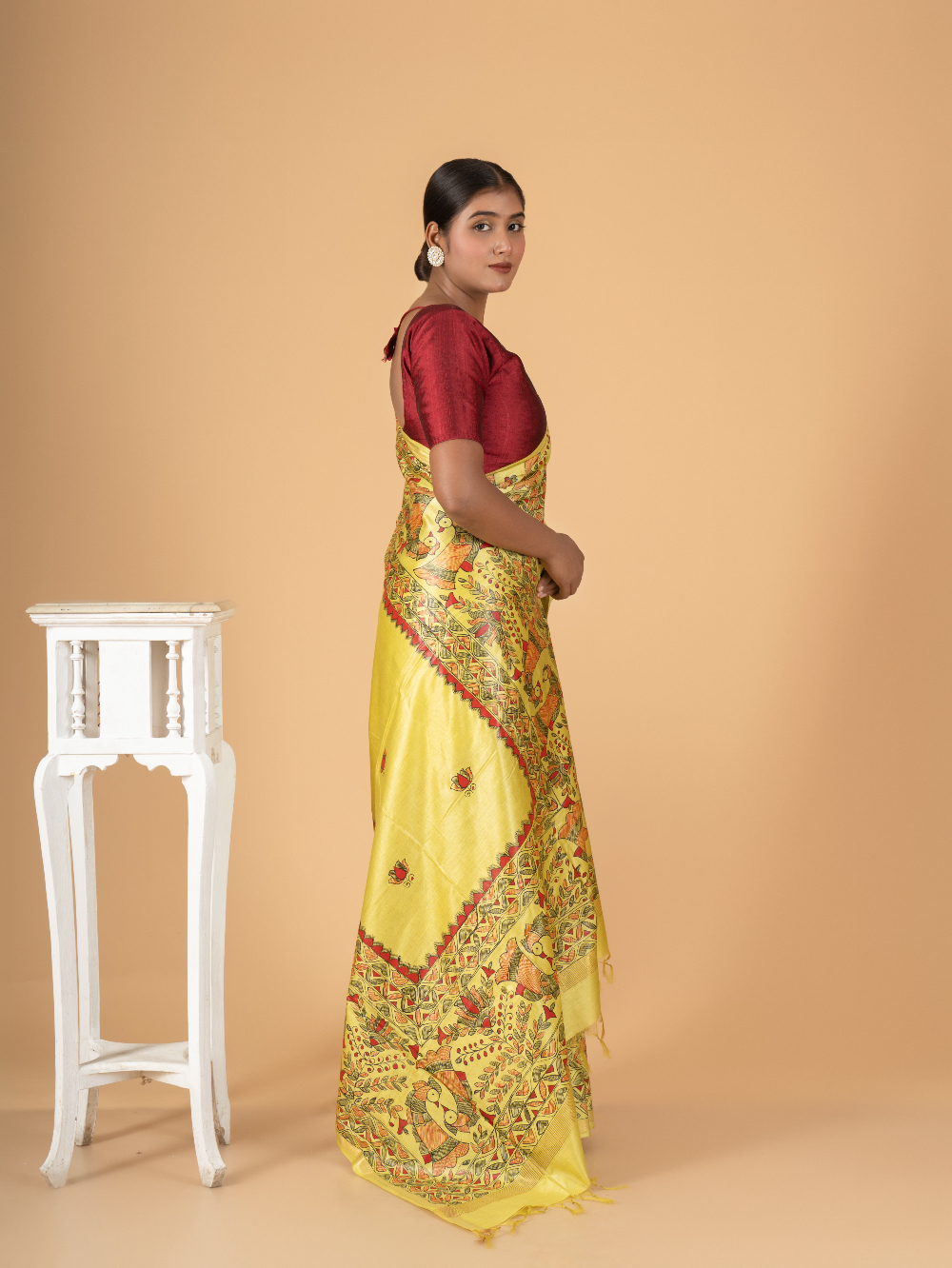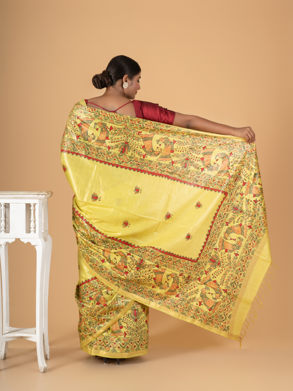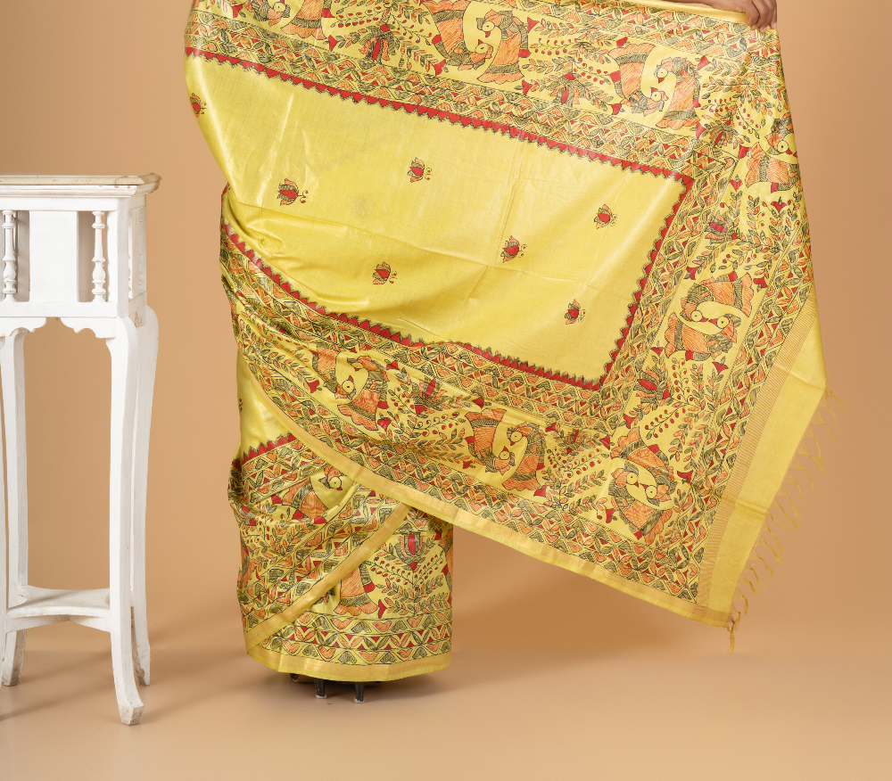 Rangrekha β Yellow Madhubani Hand-Painted Chaneri Silk Saree