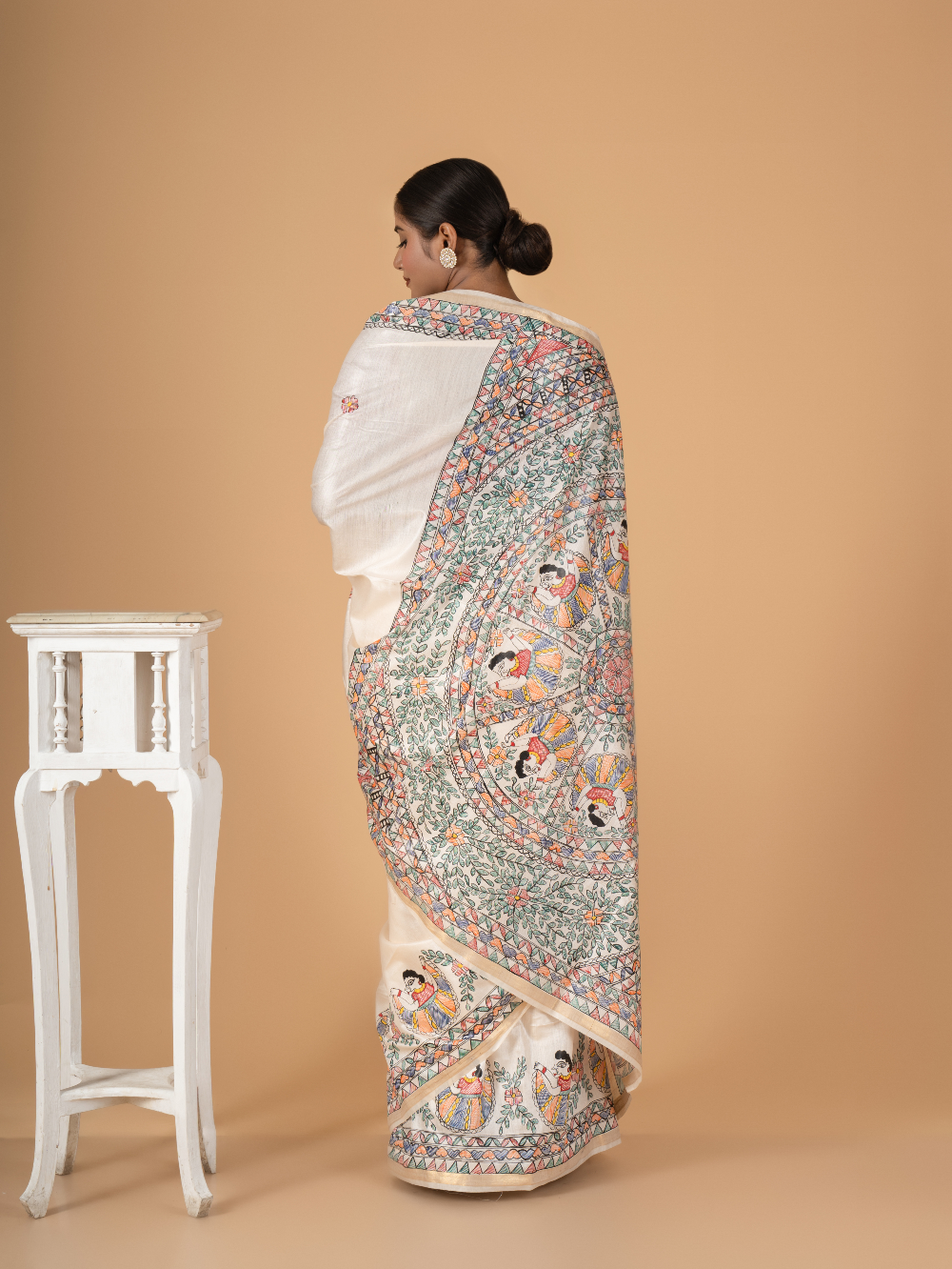 "Celebrate grace, nature, and feminine spirit with βVanya Vih?raβ, a beige Desi Tussar Silk saree adorned with hand-painted Madhubani motifs of women amidst a blooming garden. This wearable artwork ca......
