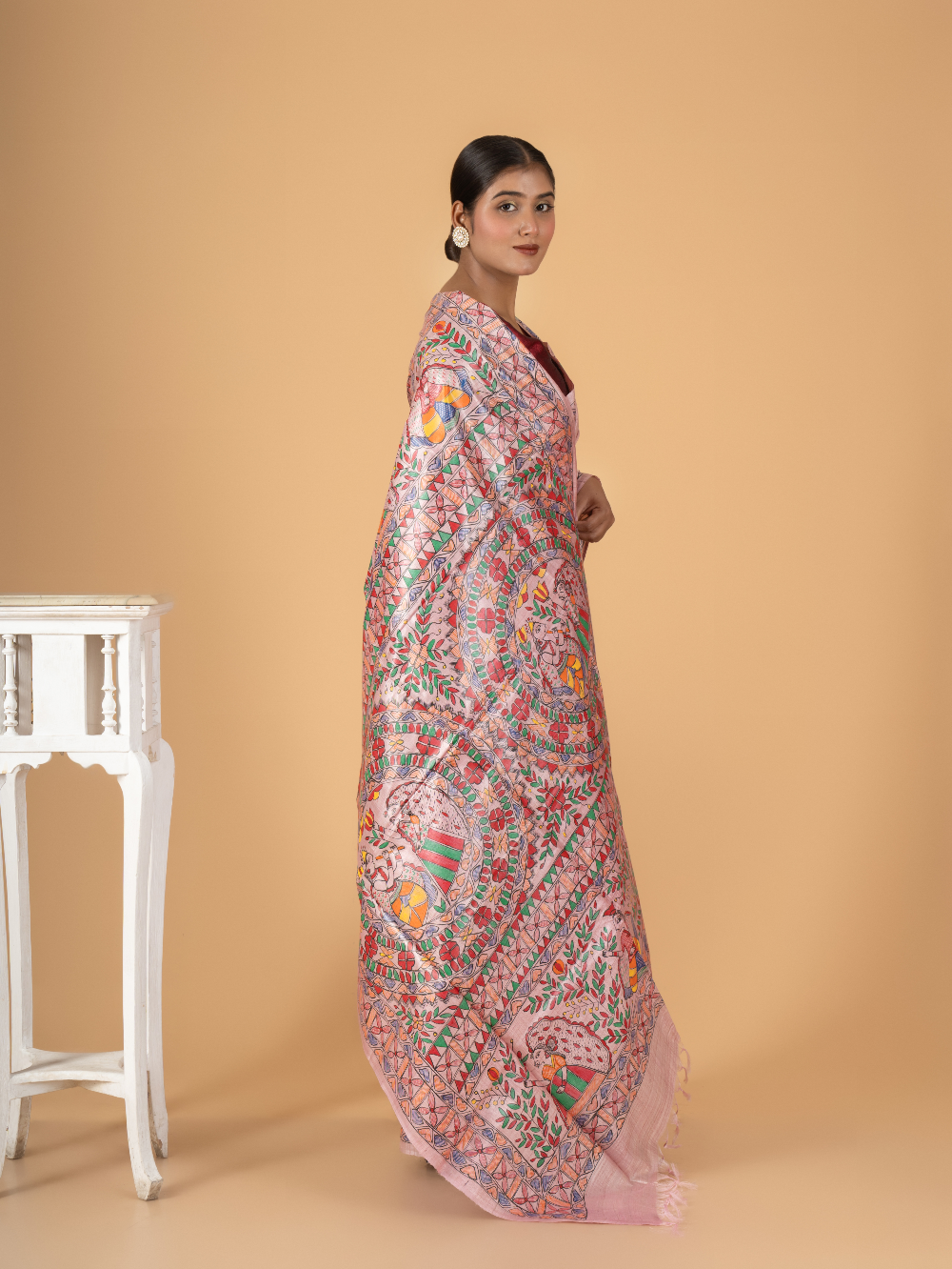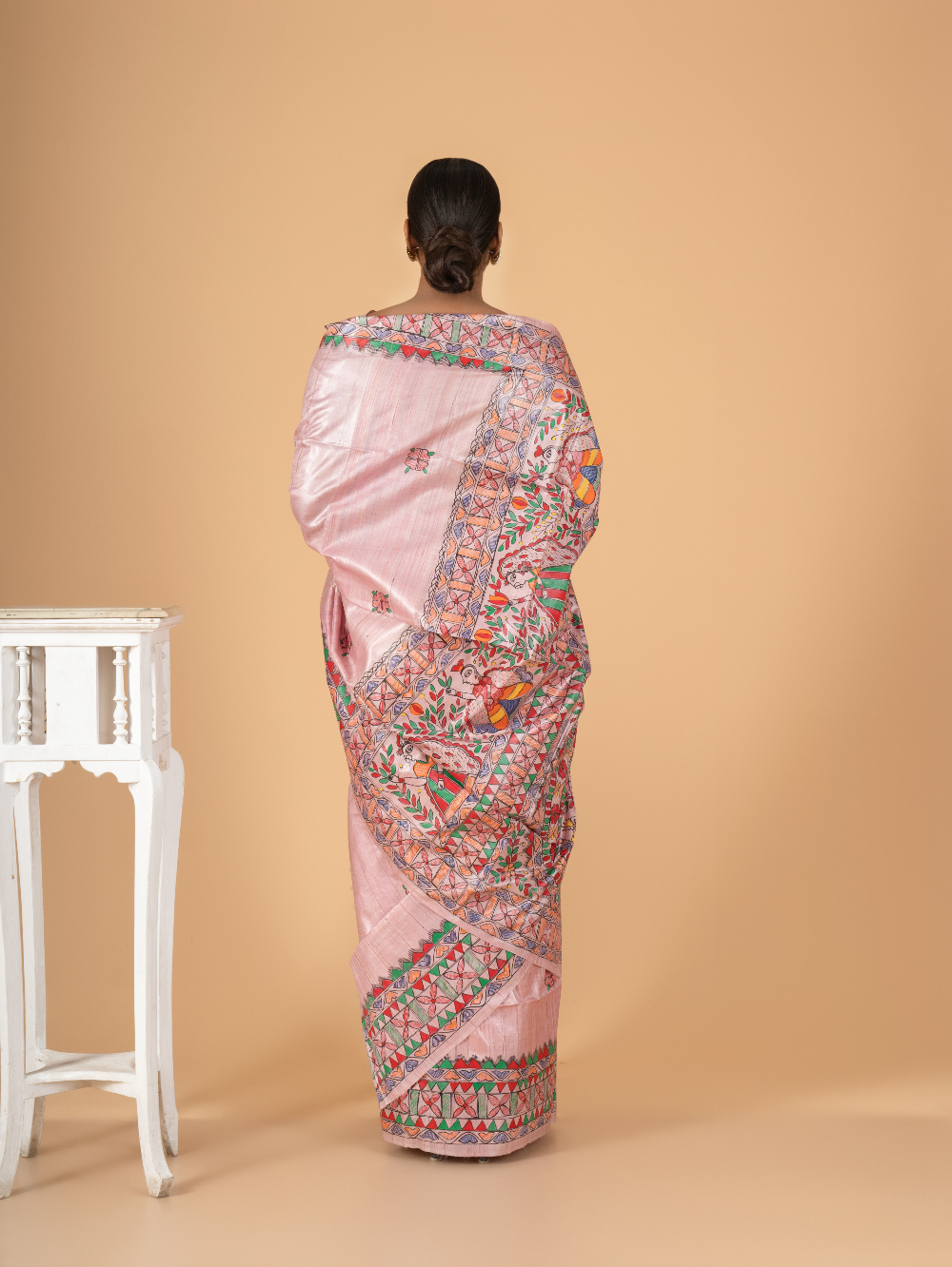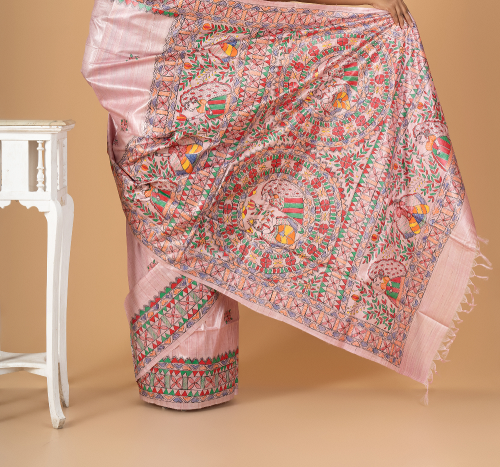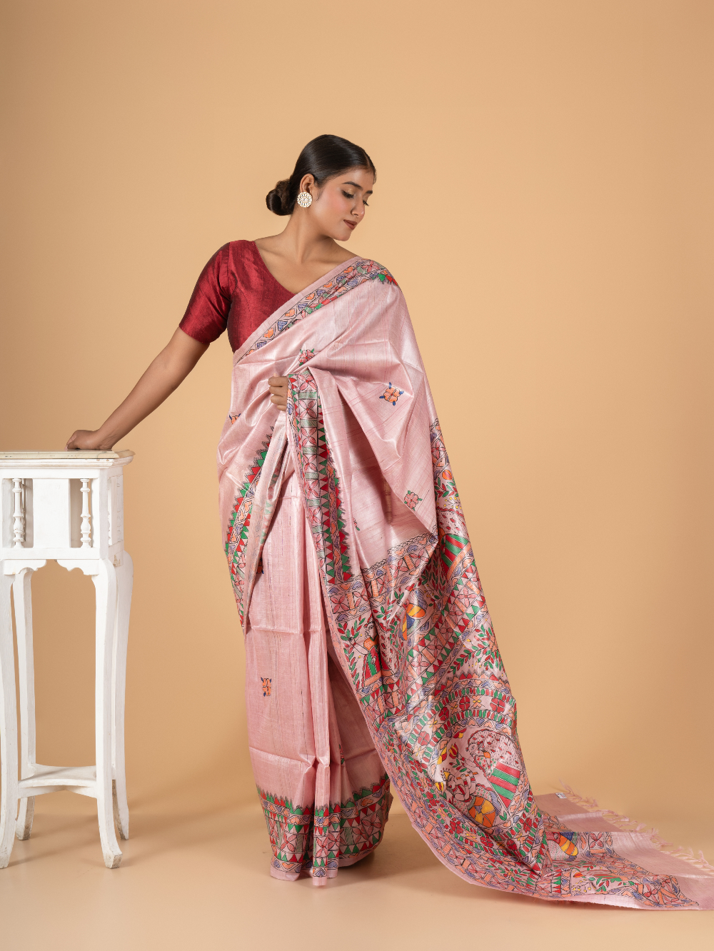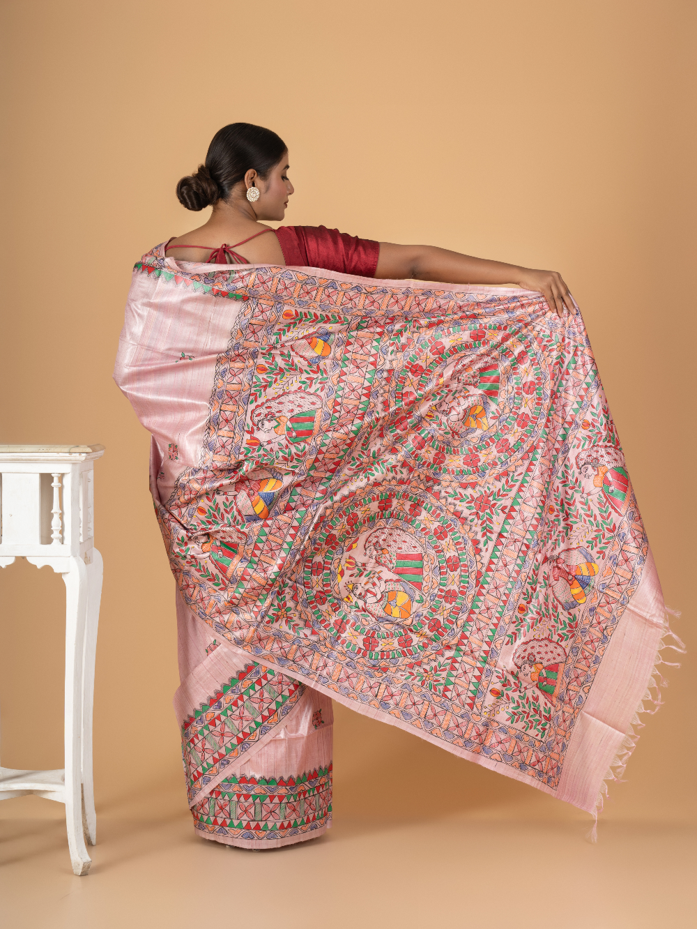 Pink Madhubani Tussar Silk Saree – Rasrang Vatika