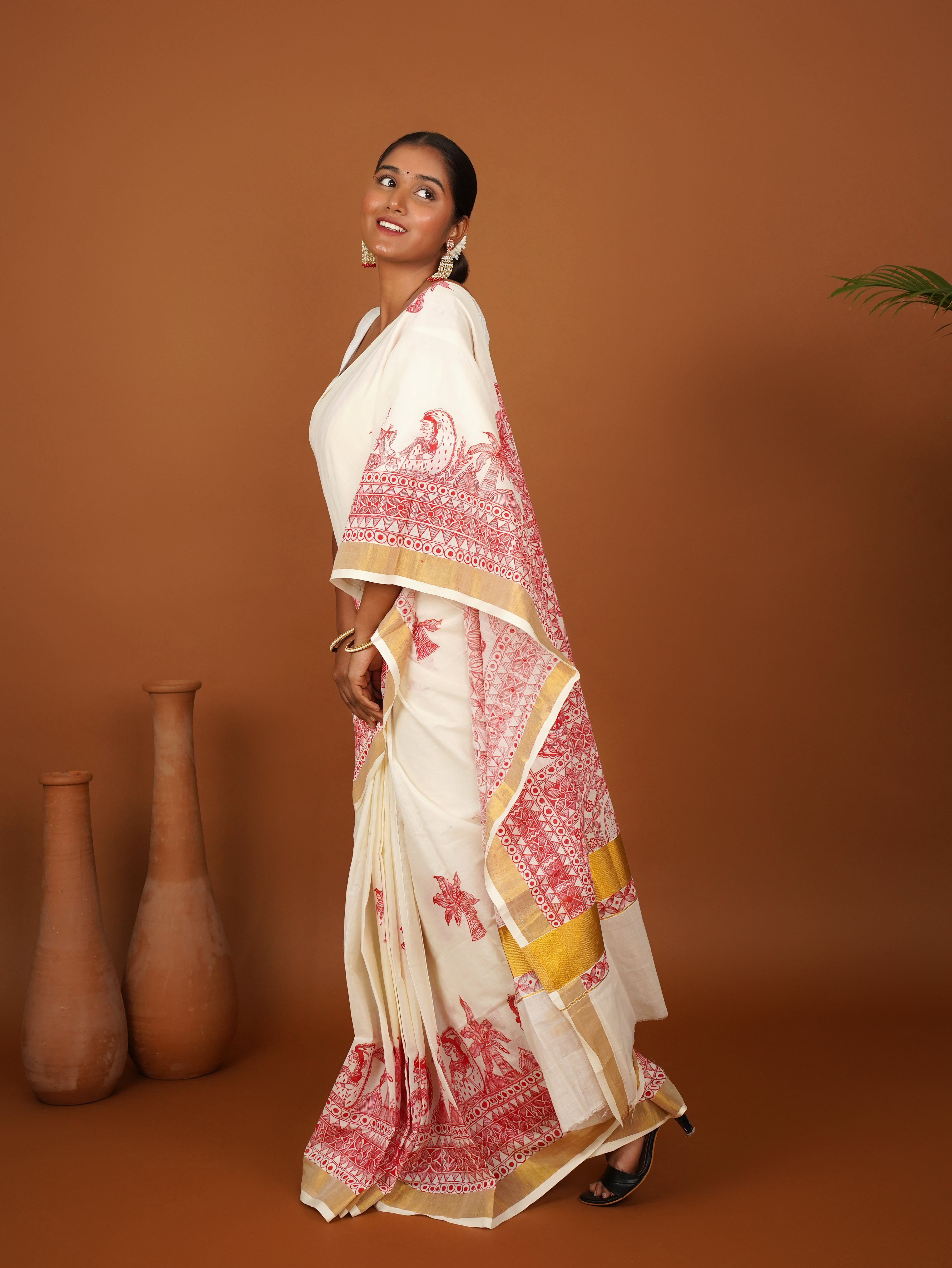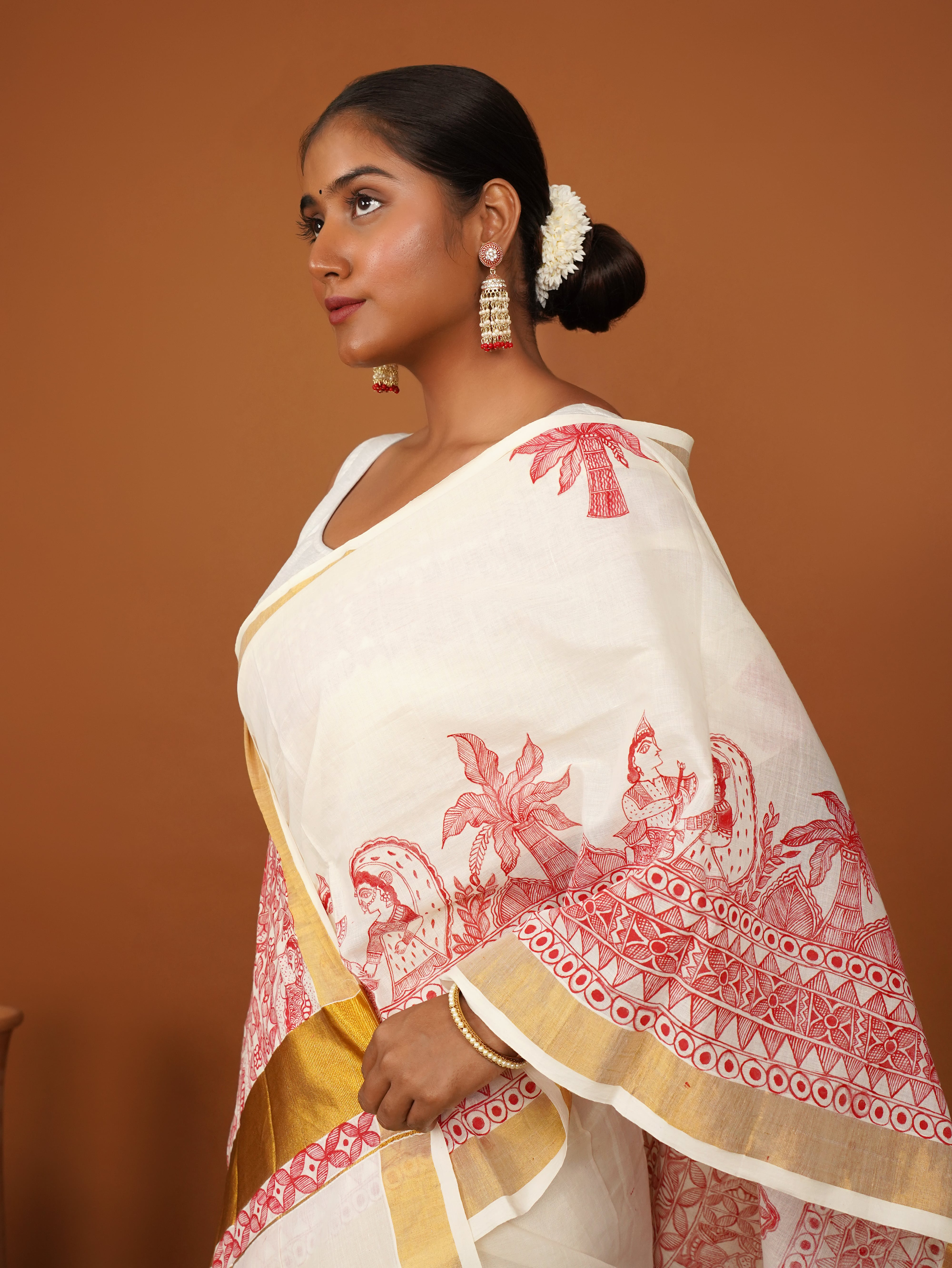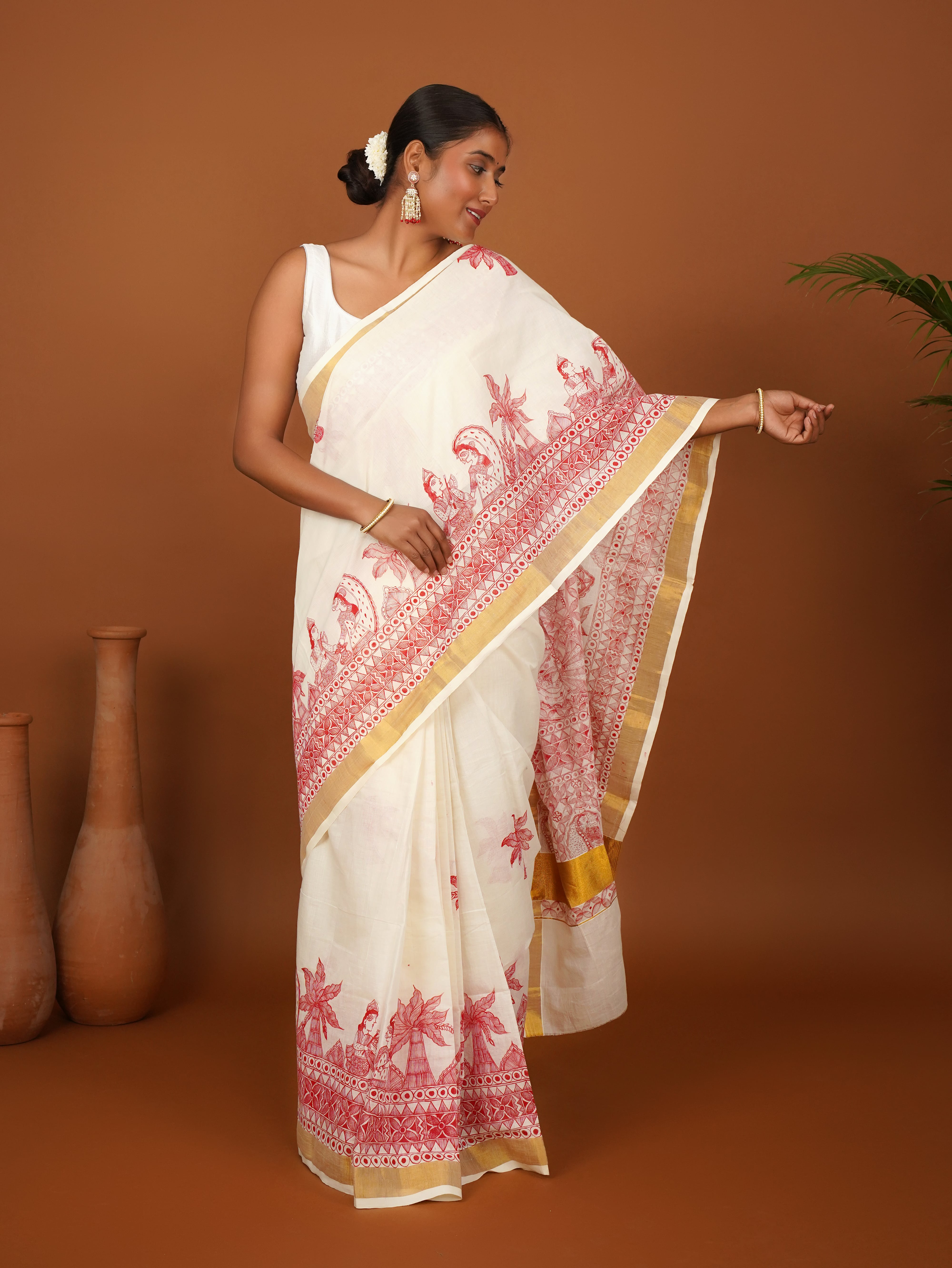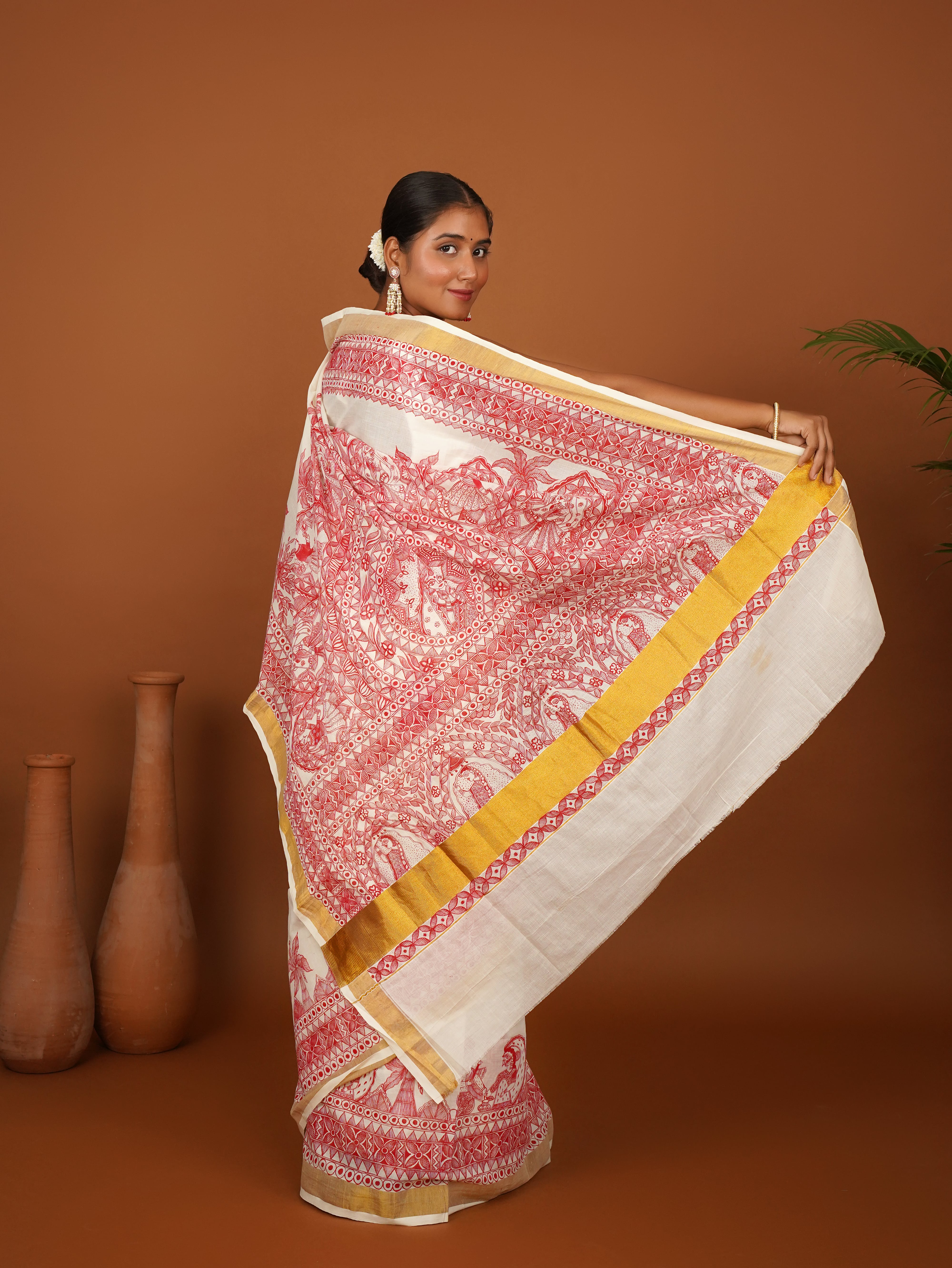Vivaah Vriksha Saree β Off White Cotton with Golden Zari Border & Handpainted Madhubani Aanchal