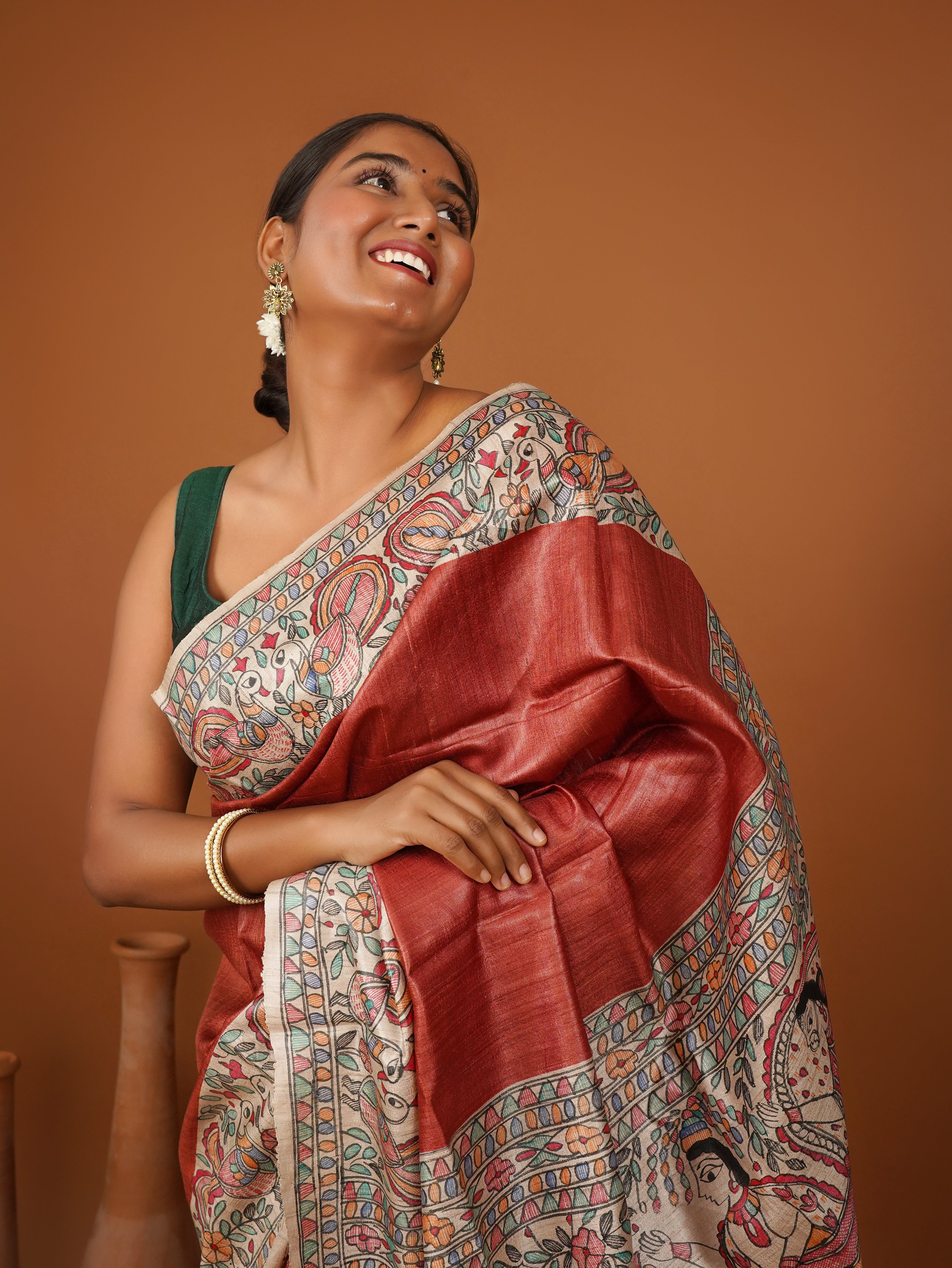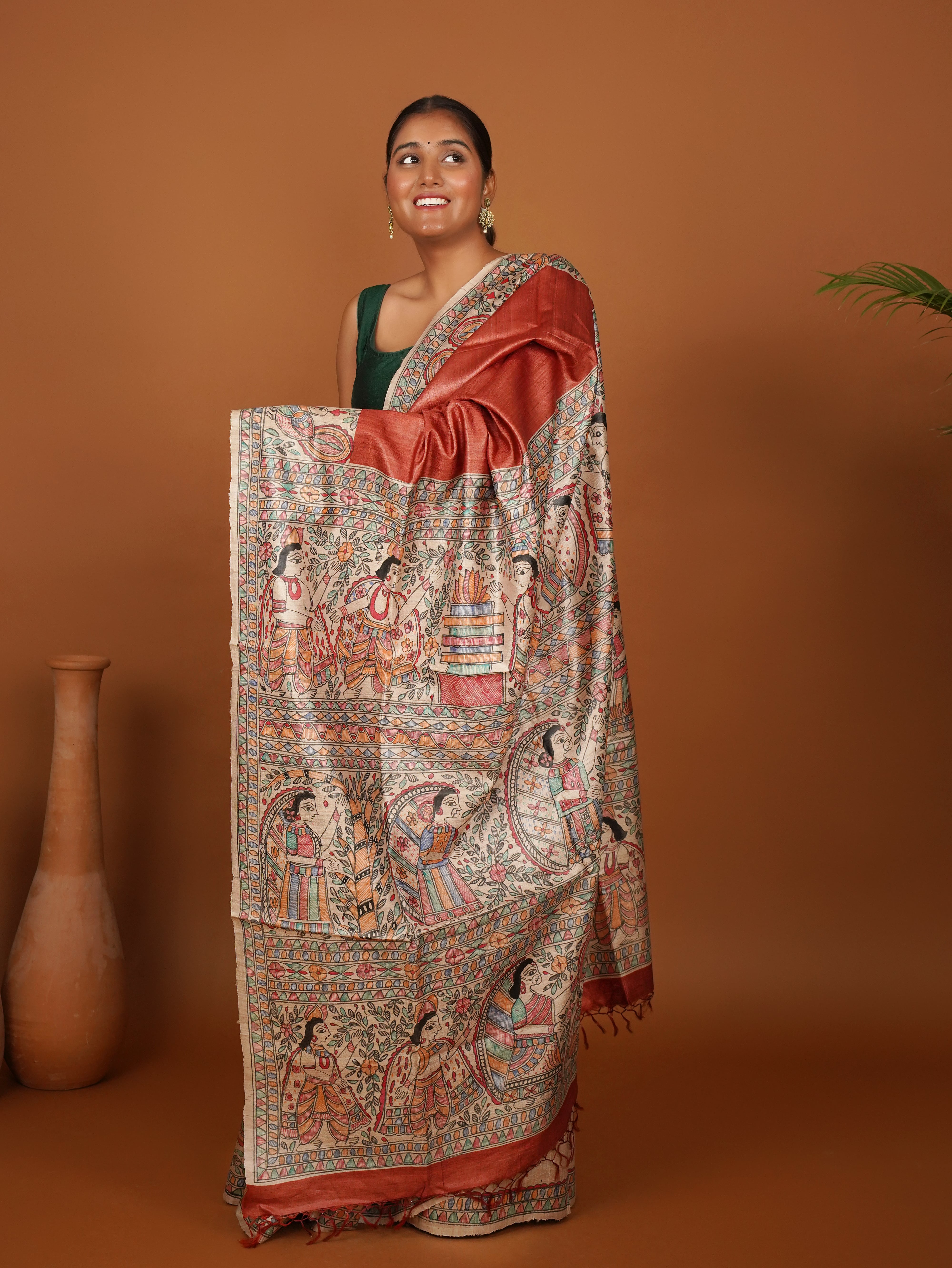Riti-Riwaaz Tussar Silk Saree – A Celebration of Tradition in Rust Orange Elegance with Madhubani Painting