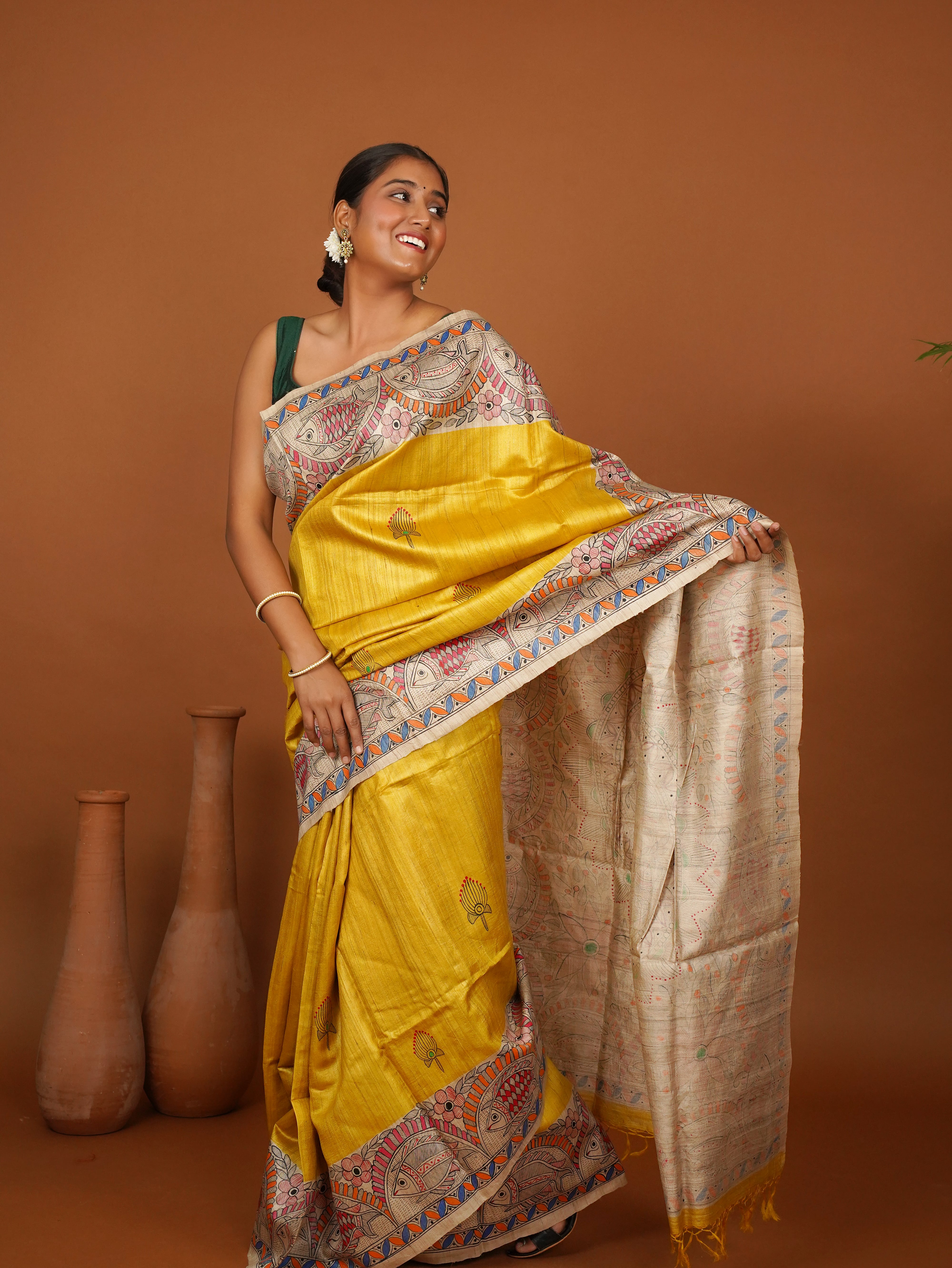 Vanraj Madhubani Painting Tussar Silk Saree β Golden Glow of Natureβs Symphony