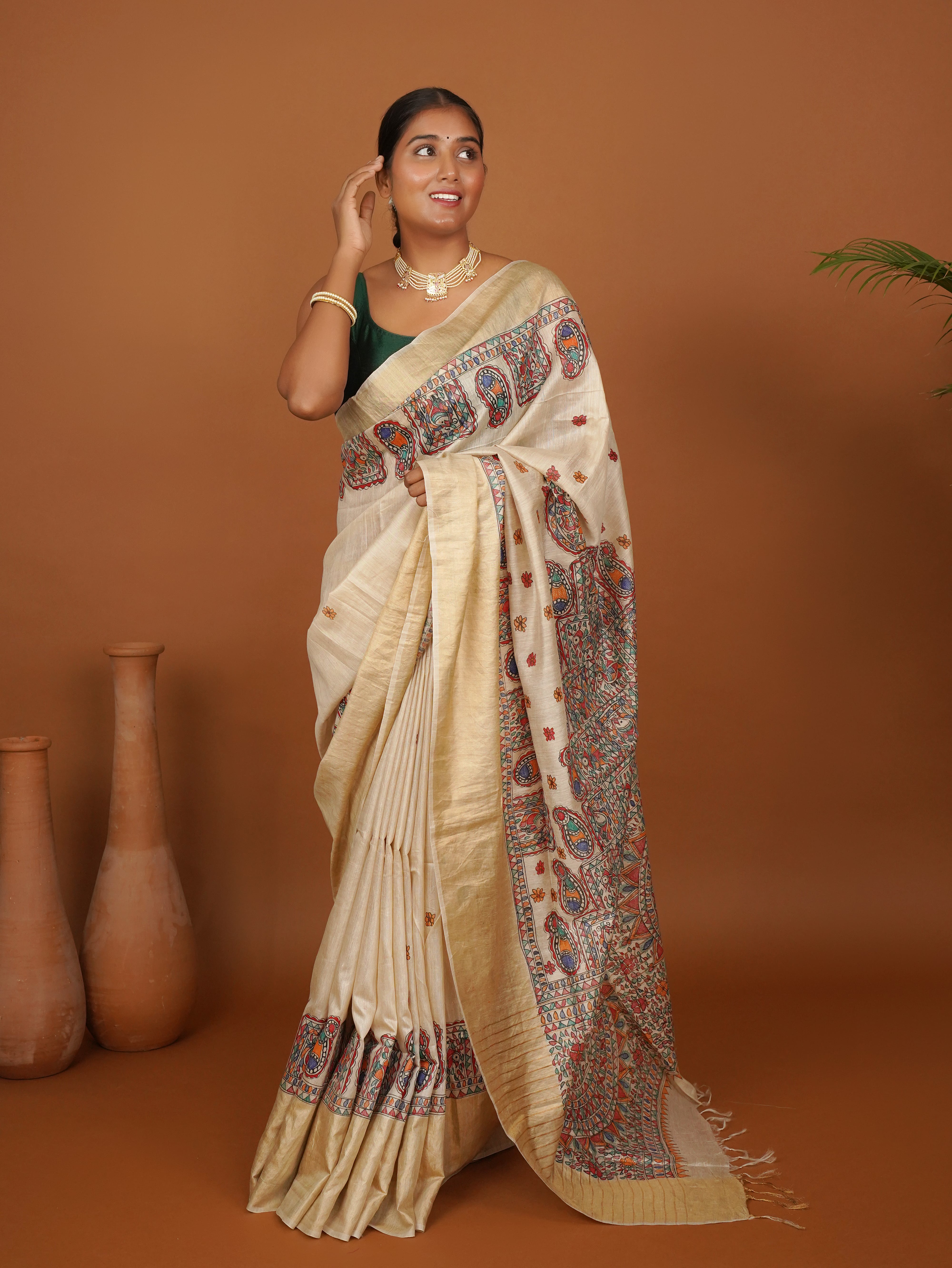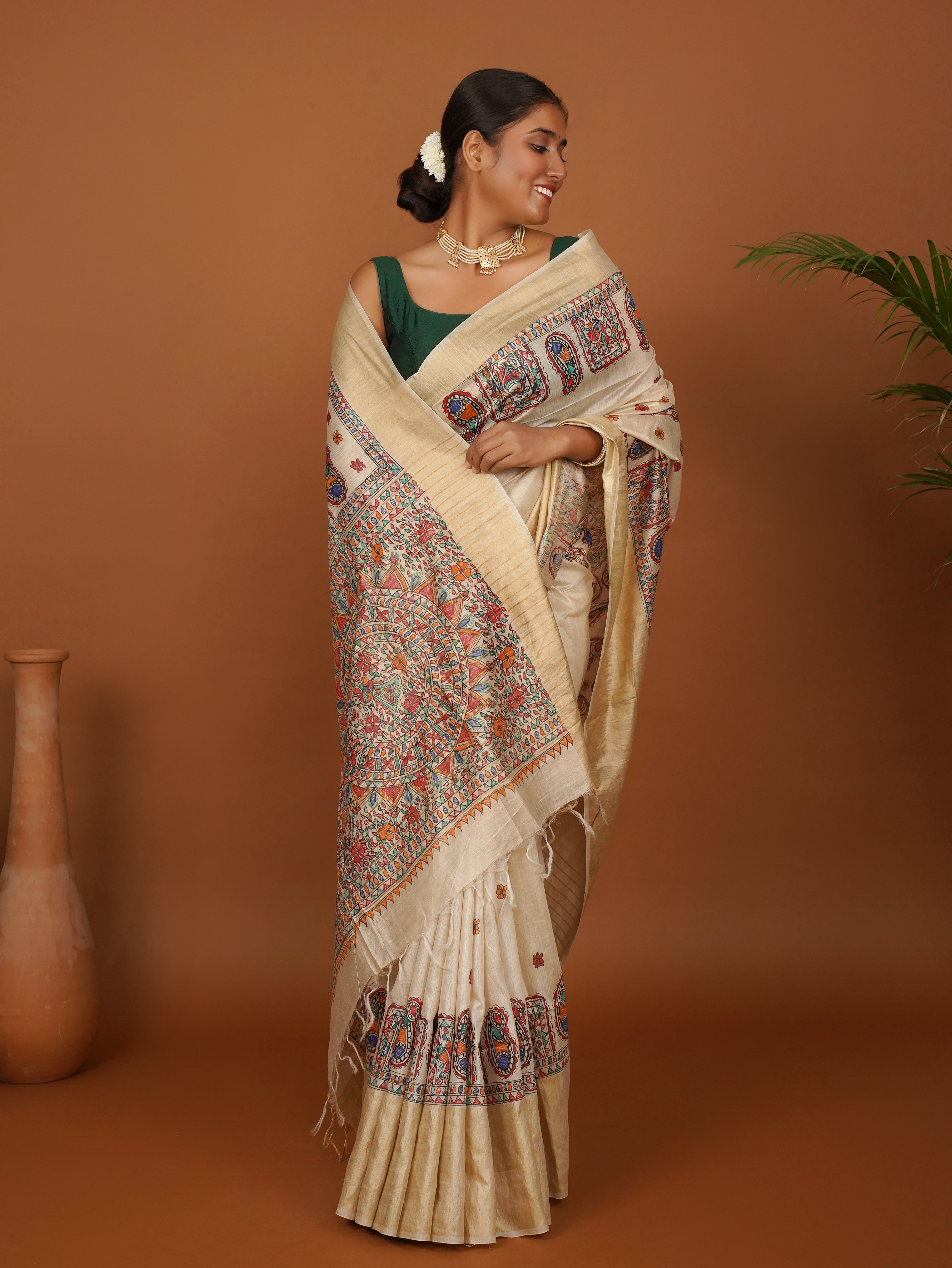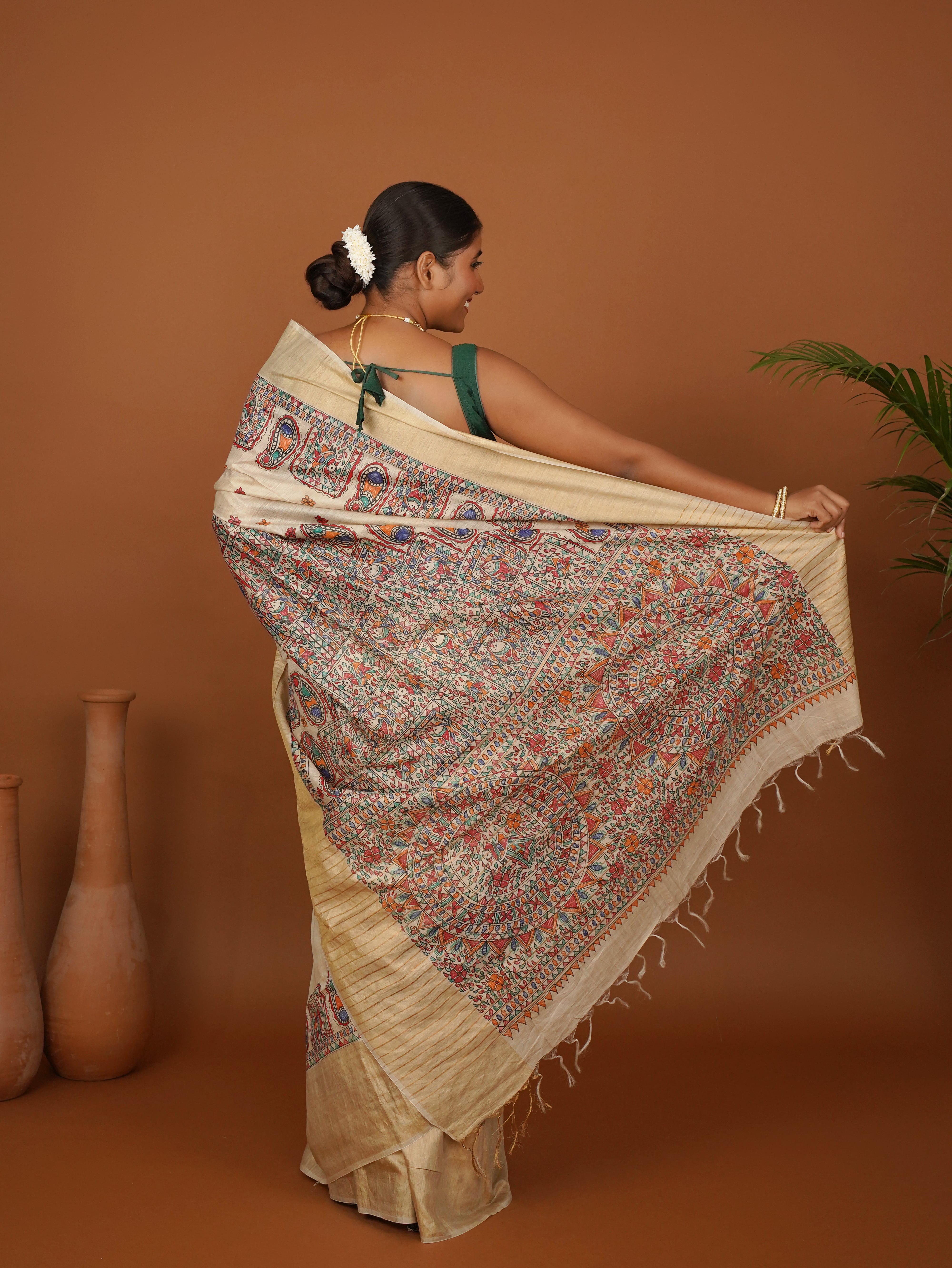 "Step into a tapestry of tradition with βKatha Kanch,β a luxurious beige Tussar silk saree adorned with a grid of handpainted Madhubani art panels β each square telling a unique folklore through vibra......