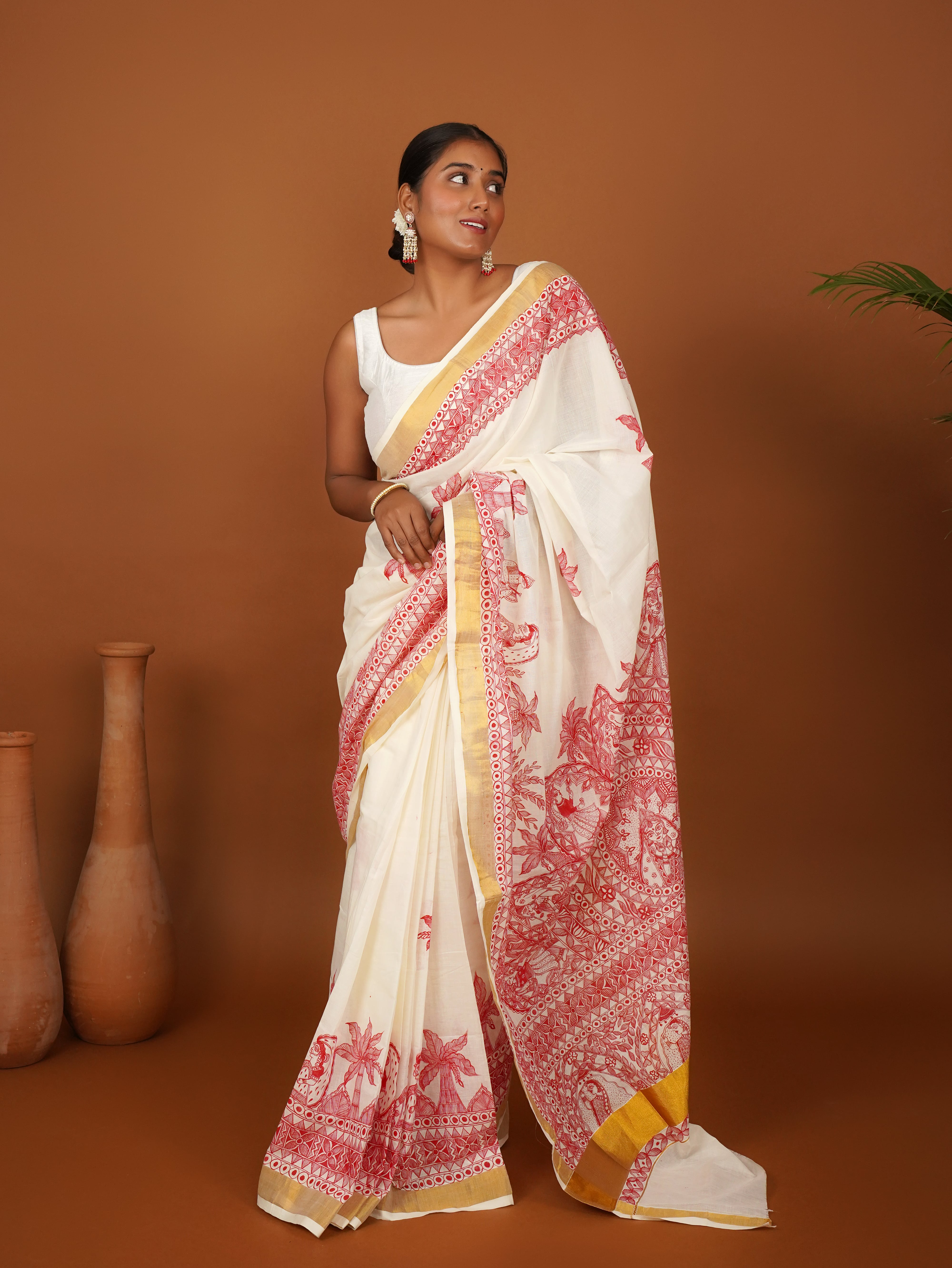 Vivaah Vriksha Saree β Off White Cotton with Golden Zari Border & Handpainted Madhubani Aanchal