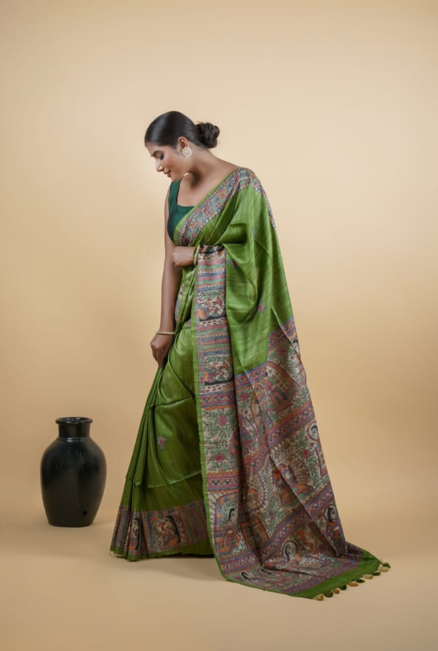 "Experience the soulful artistry of Madhubani painting with this exquisite Green Ghicha Silk Sareeβa flawless union of tradition and elegance. Each saree is hand-painted with intricate Madhubani motif......