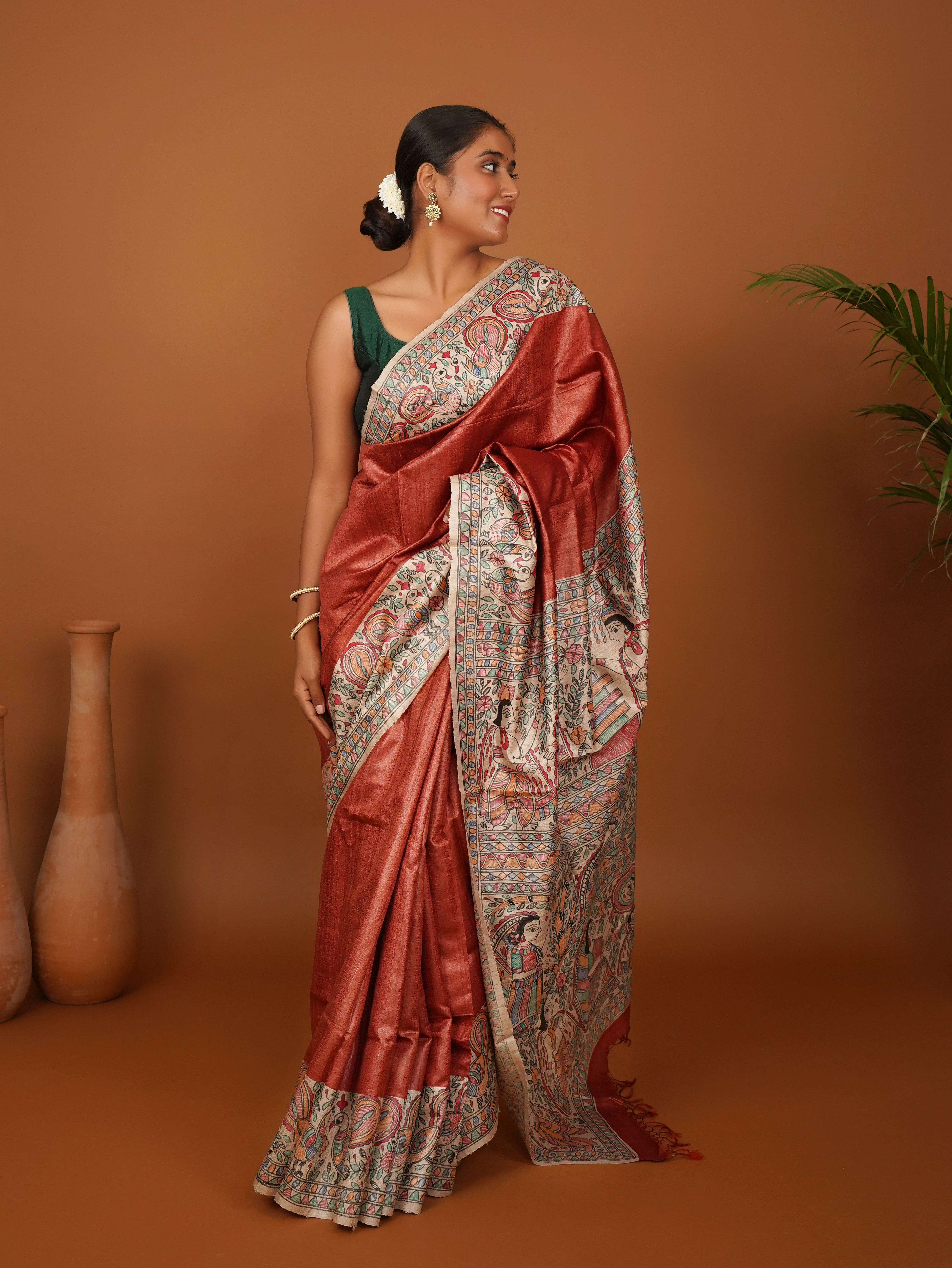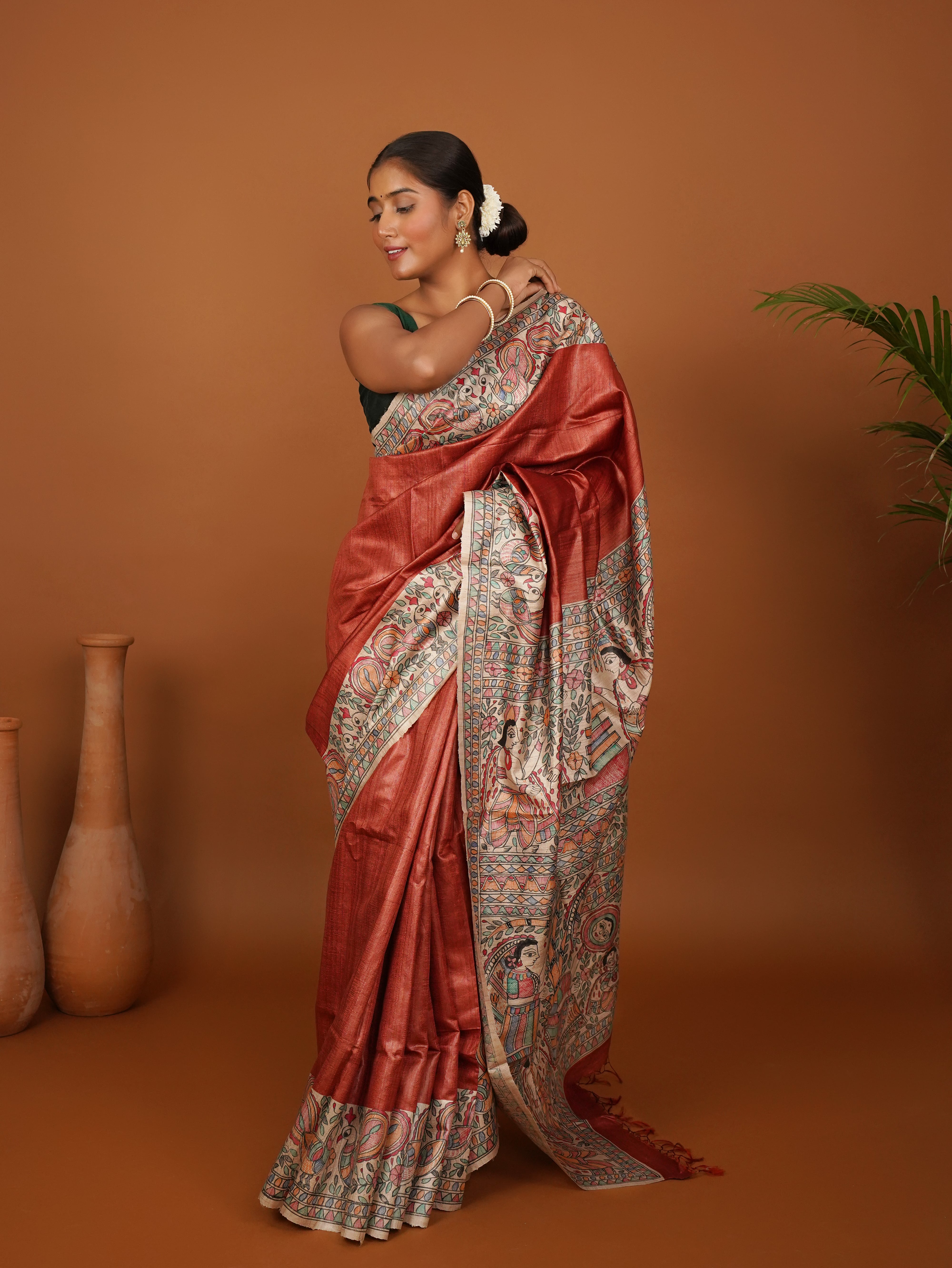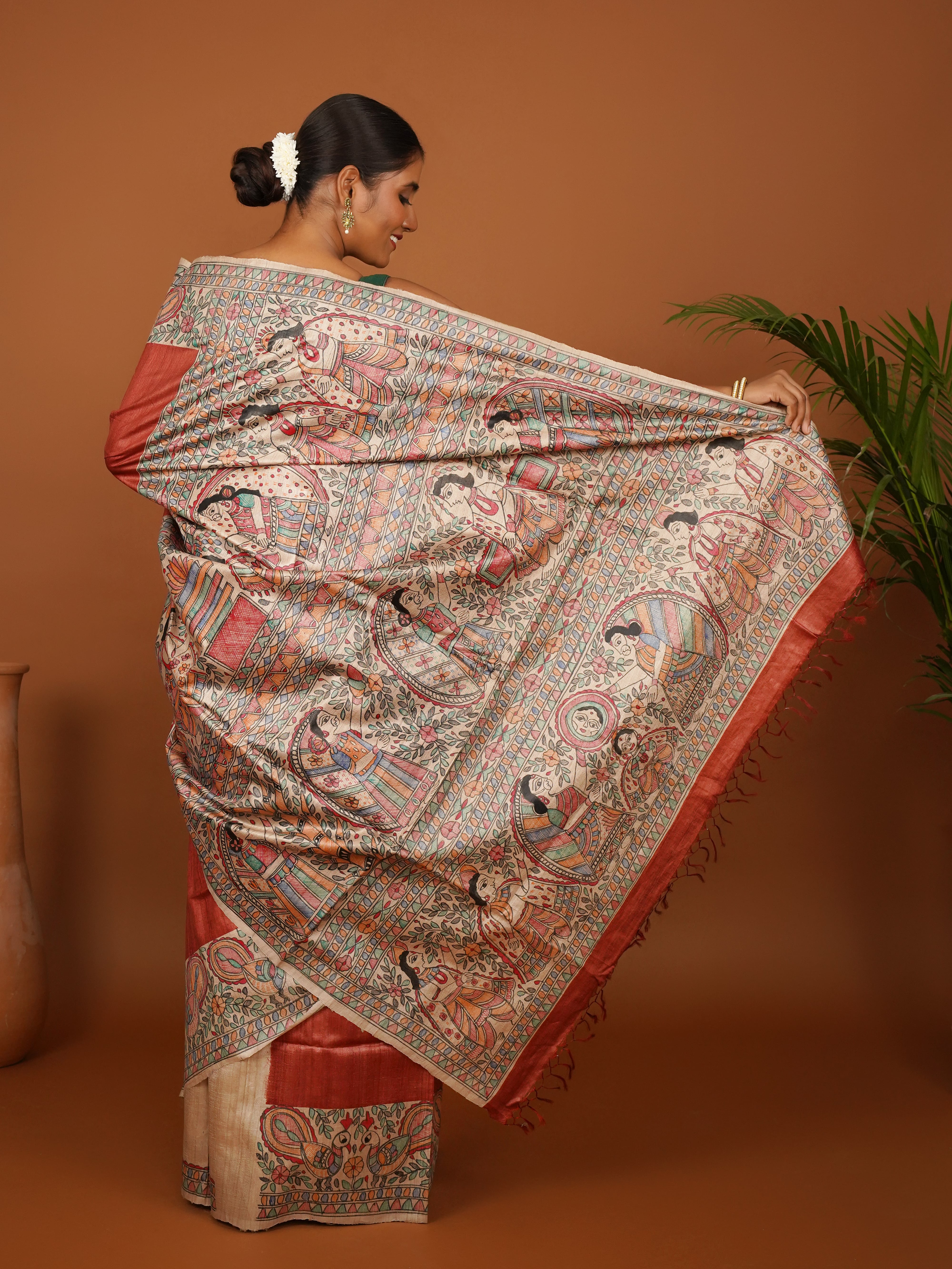 Riti-Riwaaz Tussar Silk Saree – A Celebration of Tradition in Rust Orange Elegance with Madhubani Painting