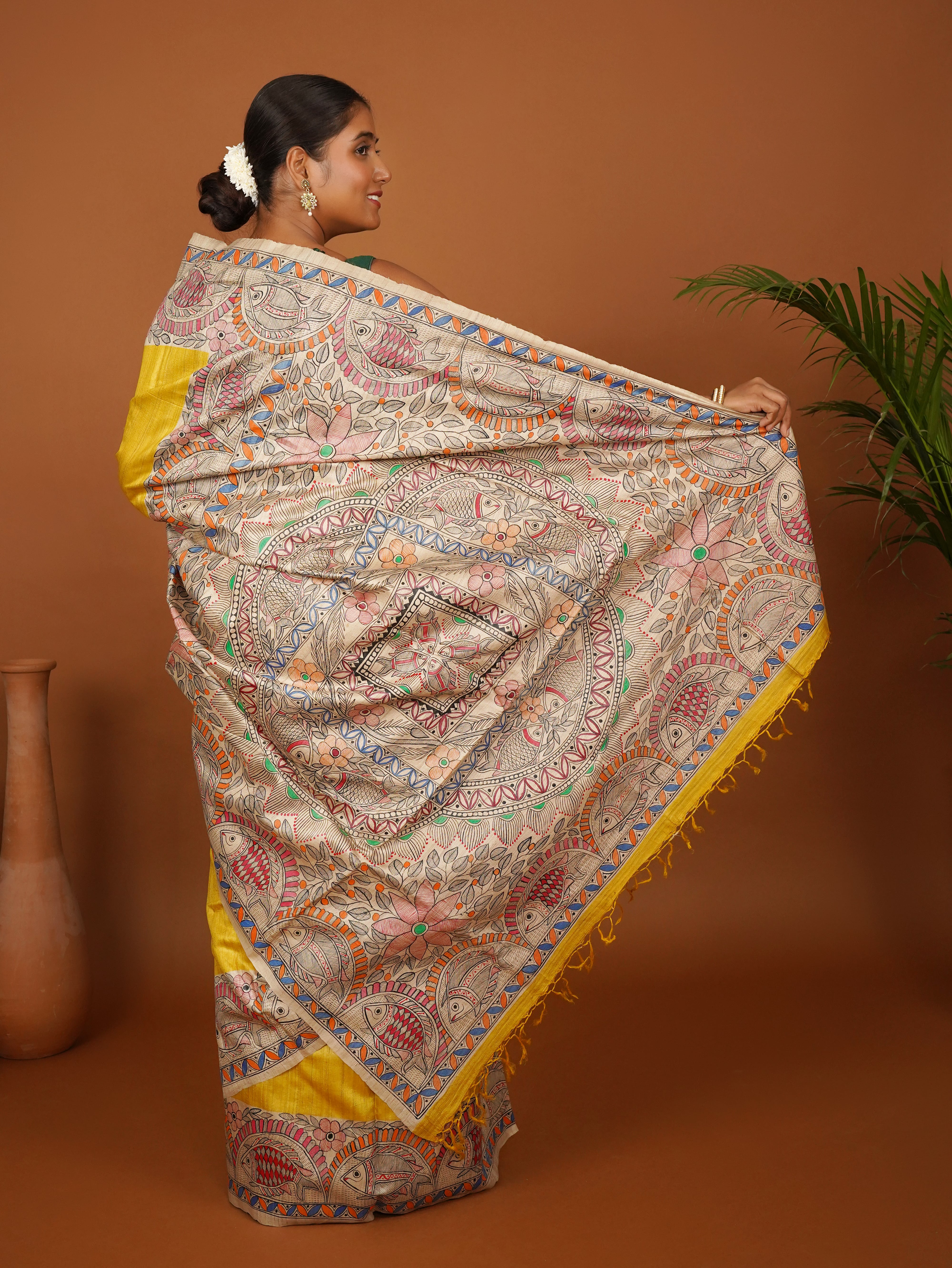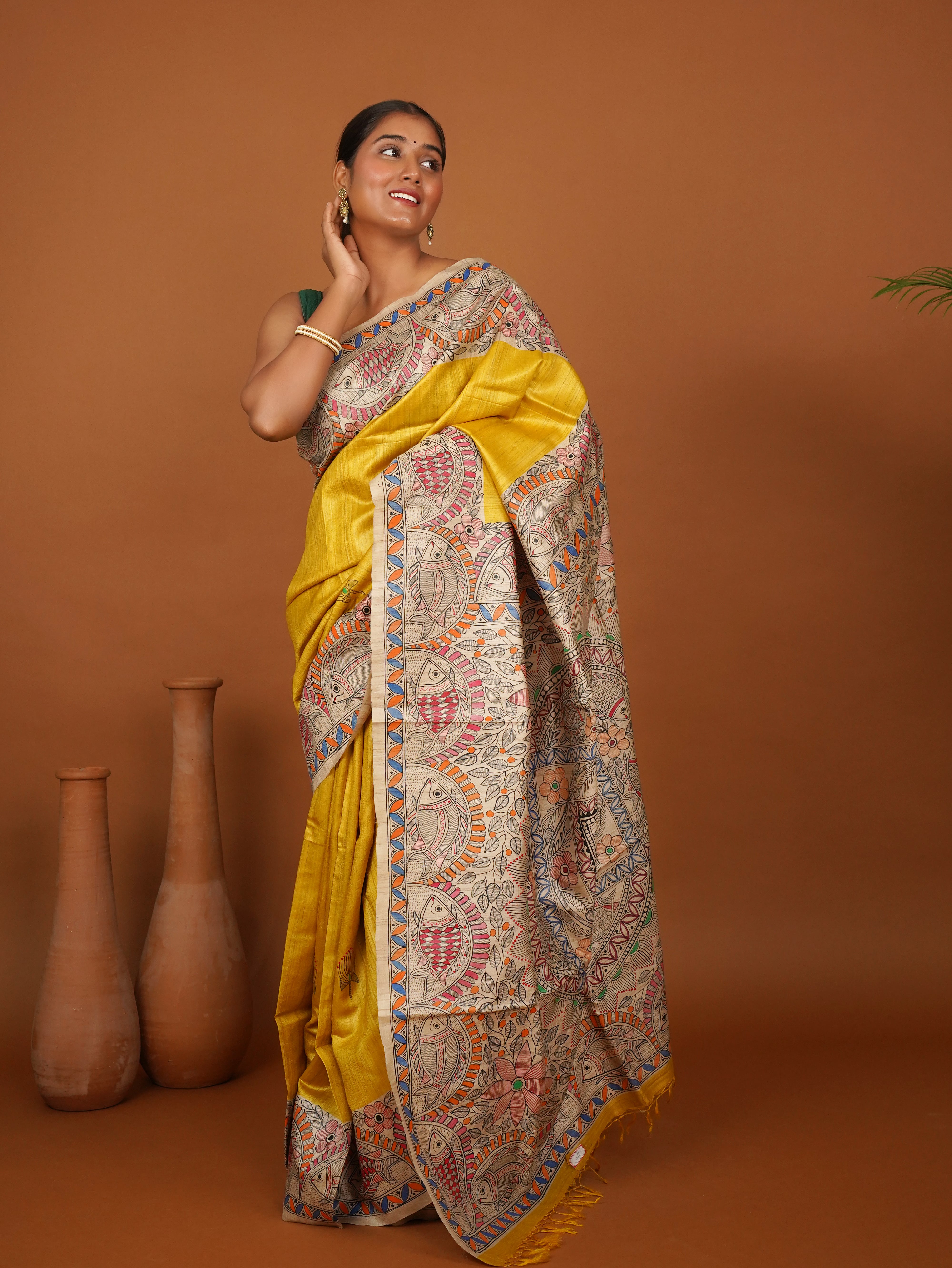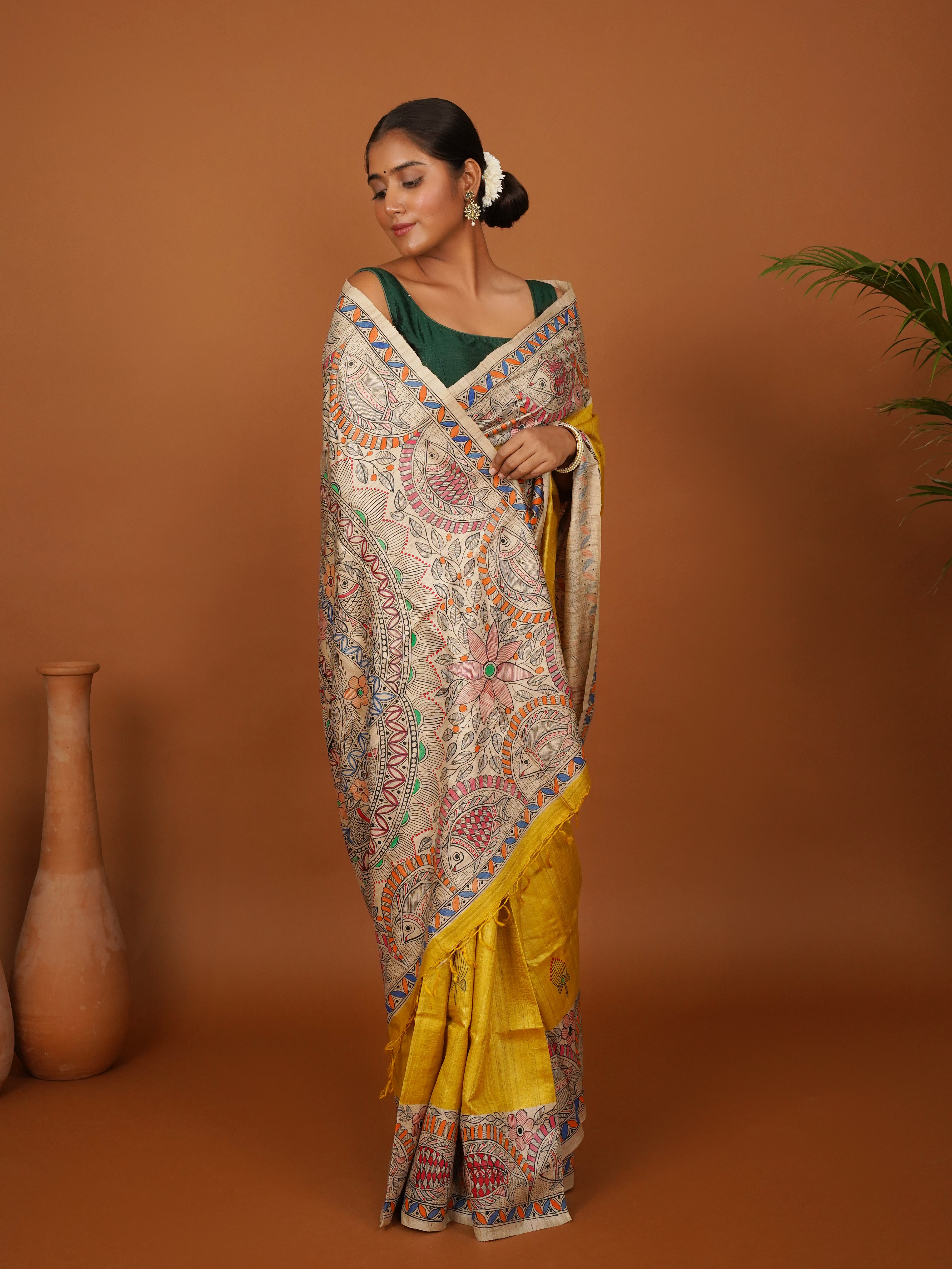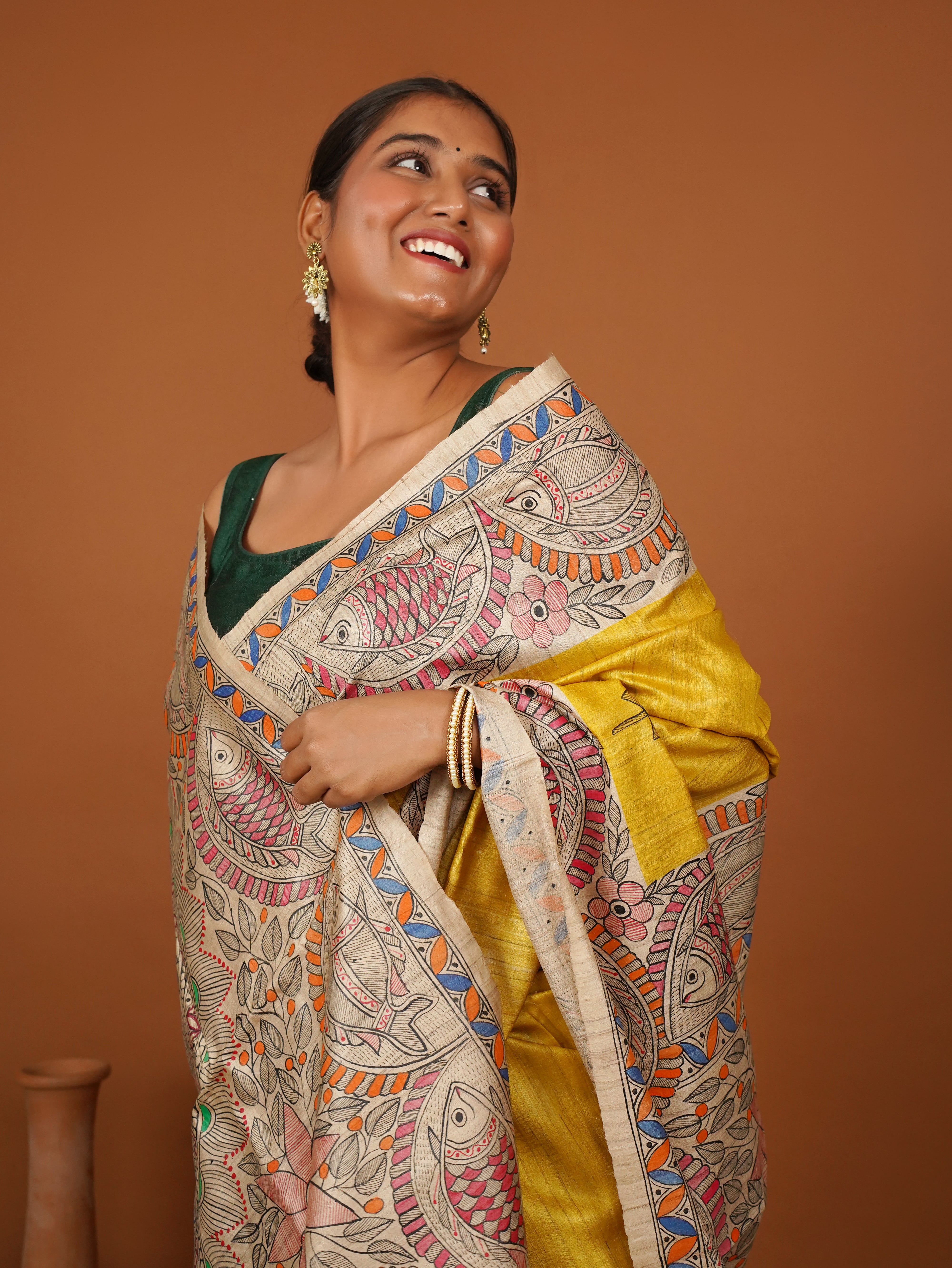 Vanraj Madhubani Painting Tussar Silk Saree β Golden Glow of Natureβs Symphony